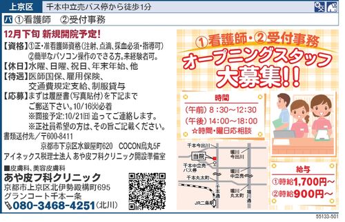 こんにちは、あや皮フ科クリニックのジムチョーです。 今朝の朝刊に折込求人広告を入れました。 看護師、受付のオープニングスタッフです。 折込やWeb広告より少しだけ詳しく書きます。 開院時期: クリニックの開院は1月ですが、12月に研修や内覧会は12月に…