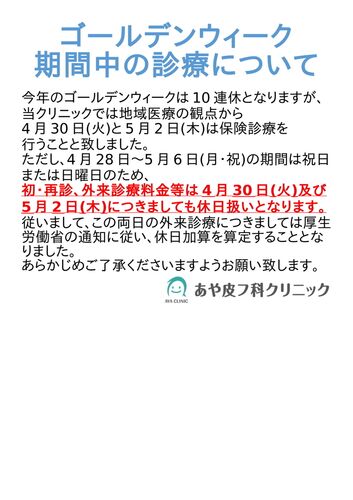 こんにちは。事務長です。 間もなくゴールデンウィーク。今年は平成から令和へ御代替わりのため世の中10連休です。 当クリニックのゴールデンウィーク中の診療は次のようになります。 4/27(土)は通常通り、午前の保険診療、午後美容診療(予約のみ) 4/28…