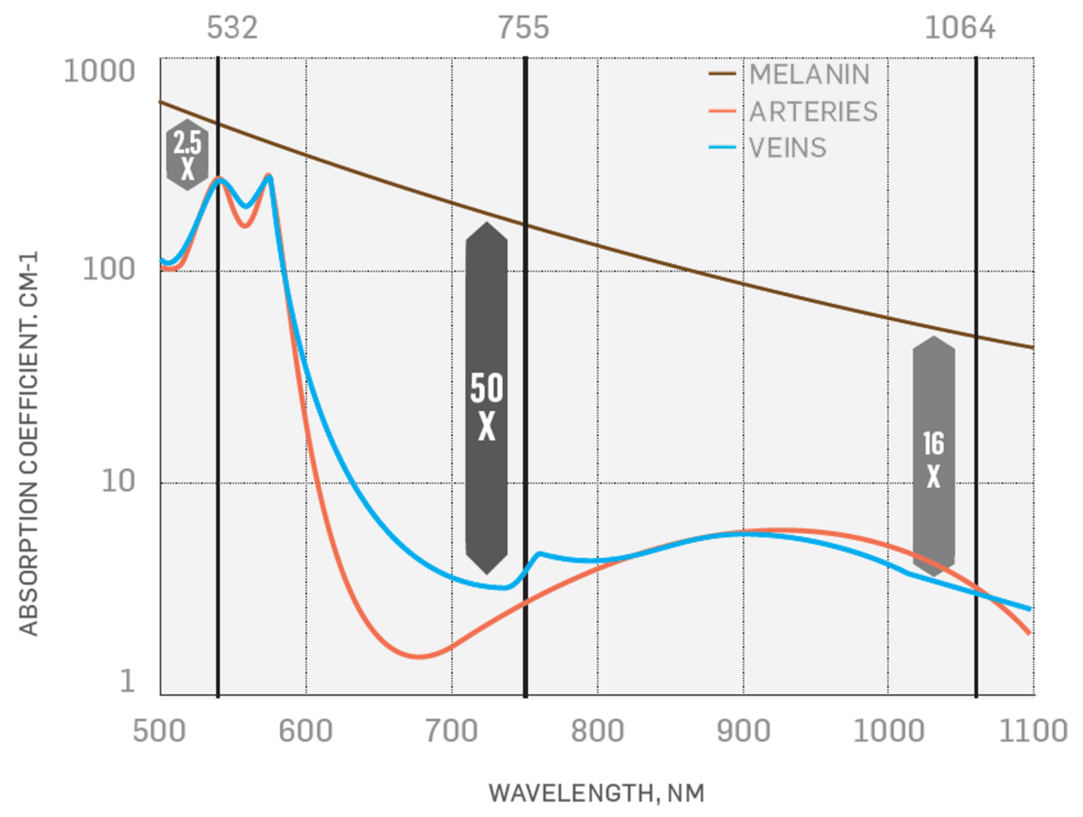 下の図の通り、アレキサンドライト波長(755nm)は、他のピコレーザーのNd-YAG波長(1064nm)と比較して、メラニン色素に対する吸収率が3倍と高いため、低エネルギーでもより高い効果が期待できます。